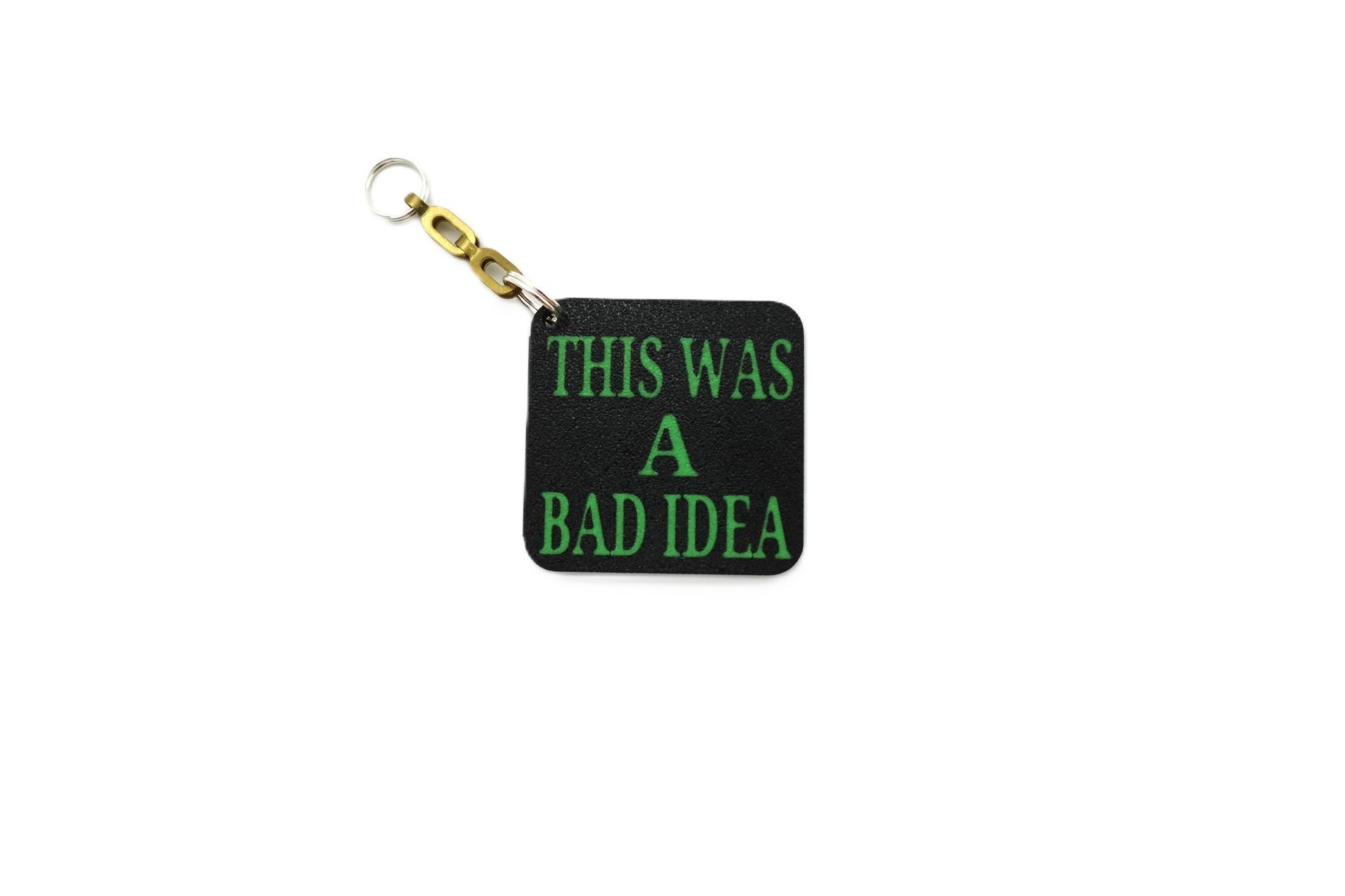 This Was a Bad Idea keychain with bold green lettering. Lightweight, durable, and perfect for everyday use or a funny, relatable gift.